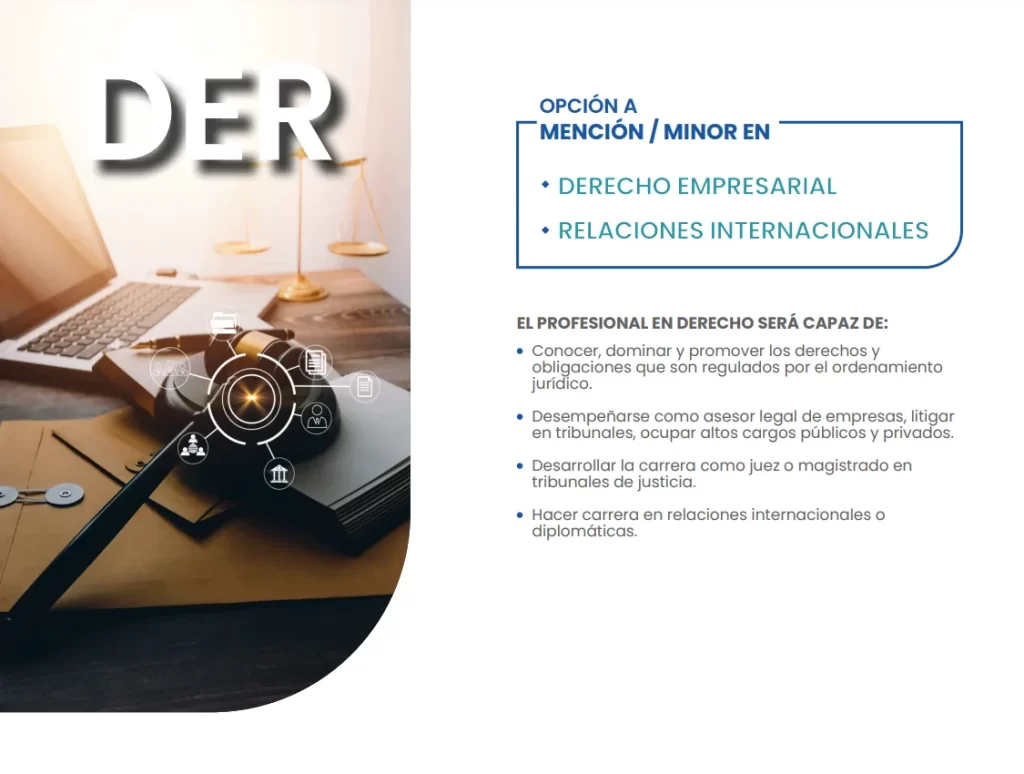 - Oportunidad de elegir entre dos menciones para graduarte: Relaciones Internacionales o Derecho Corporativo.