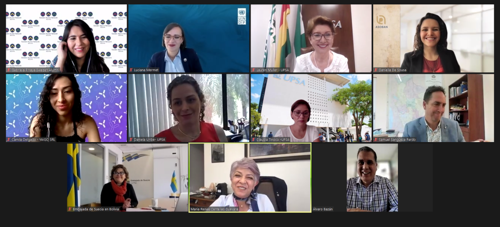 Lauren Müller de Pacheco, Rectora de la Universidad Privada de Santa Cruz de la Sierra (UPSA), fue invitada a tomar parte en el Conversatorio sobre Desarrollo Sostenible que organizó la red de ex estudiantes bolivianos en Suecia (Sweden Alumni Network-Bolivia).