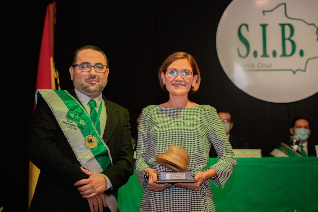 Claudia Mayela Tinoco Guerrero, jefe de la carrera Ingeniería Industrial y de Sistemas de la UPSA, recibió una distinción por parte de la Sociedad de Ingenieros de Bolivia (SIB).