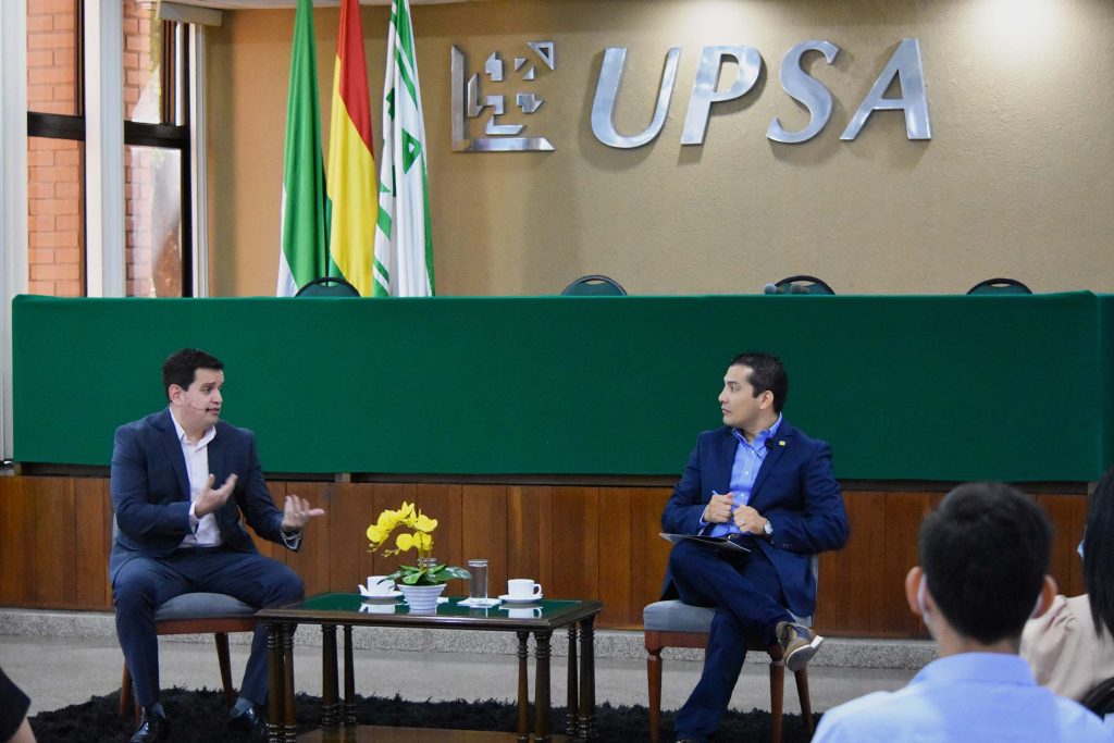 El estreno de un ciclo de diálogos con líderes empresariales e institucionales tuvo lugar el 20 de abril, en el Aula Magna, con la presencia de Leonardo Salvatierra Chávez, CEO de la cadena de Farmacias Chávez, quien fue entrevistado por el Vicerrector de la UPSA, Sergio Daga Mérida.