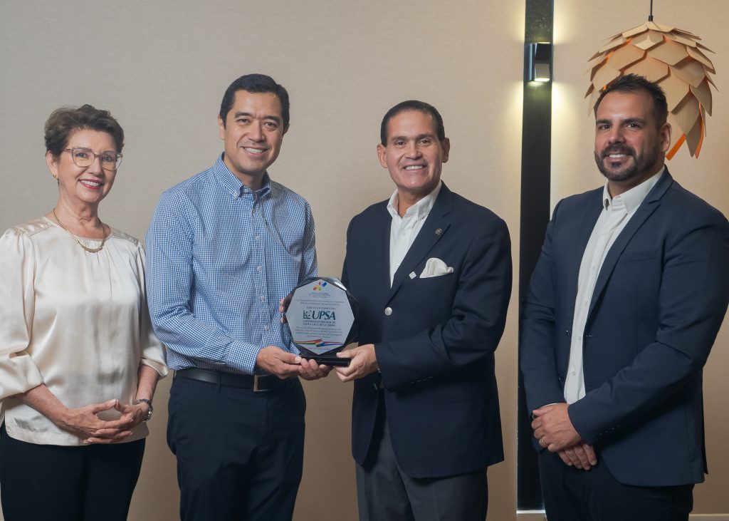 La Universidad Privada de Santa Cruz de la Sierra – UPSA continúa cosechando reconocimientos y distinciones en torno a los festejos por sus 40 años. En esta ocasión, el presidente del Directorio Fundación UPSA, Alejandro Lora, y Lauren Müller, Rectora de la Universidad, recibieron las distinciones por parte de José Luis Camacho Miserendino a nombre de Nacional Seguros, y de la Cámara Binacional de Industria y Comercio Boliviano Paraguaya.