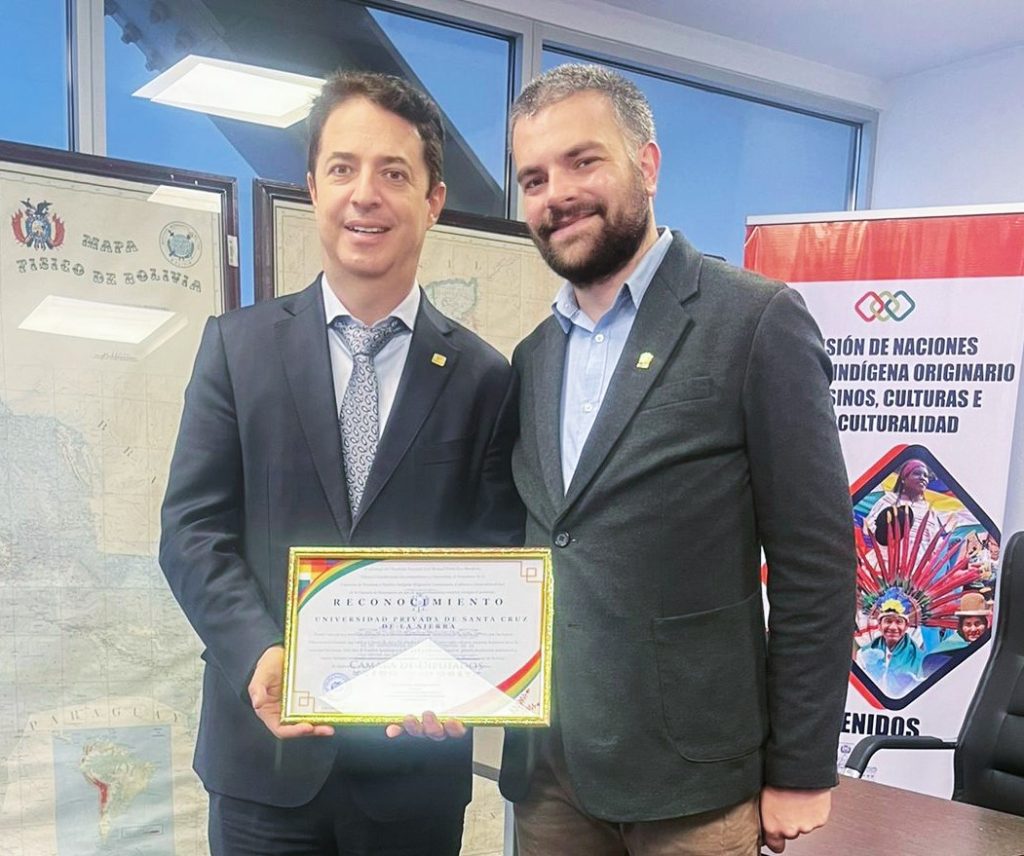 La UPSA recibió por parte de la Comisión de Naciones y Pueblos Indígena Originario Campesino, Culturas e Interculturalidad de la Cámara de Diputados de Bolivia, el reconocimiento a su trayectoria institucional en el marco de su aniversario 40, entregado por el diputado José Manuel Ormachea Mendieta, a Federico Stelzer Castedo, vicepresidente del Directorio UPSA, y Luis Foianini, director de Vínculo Empresarial de la Universidad.
