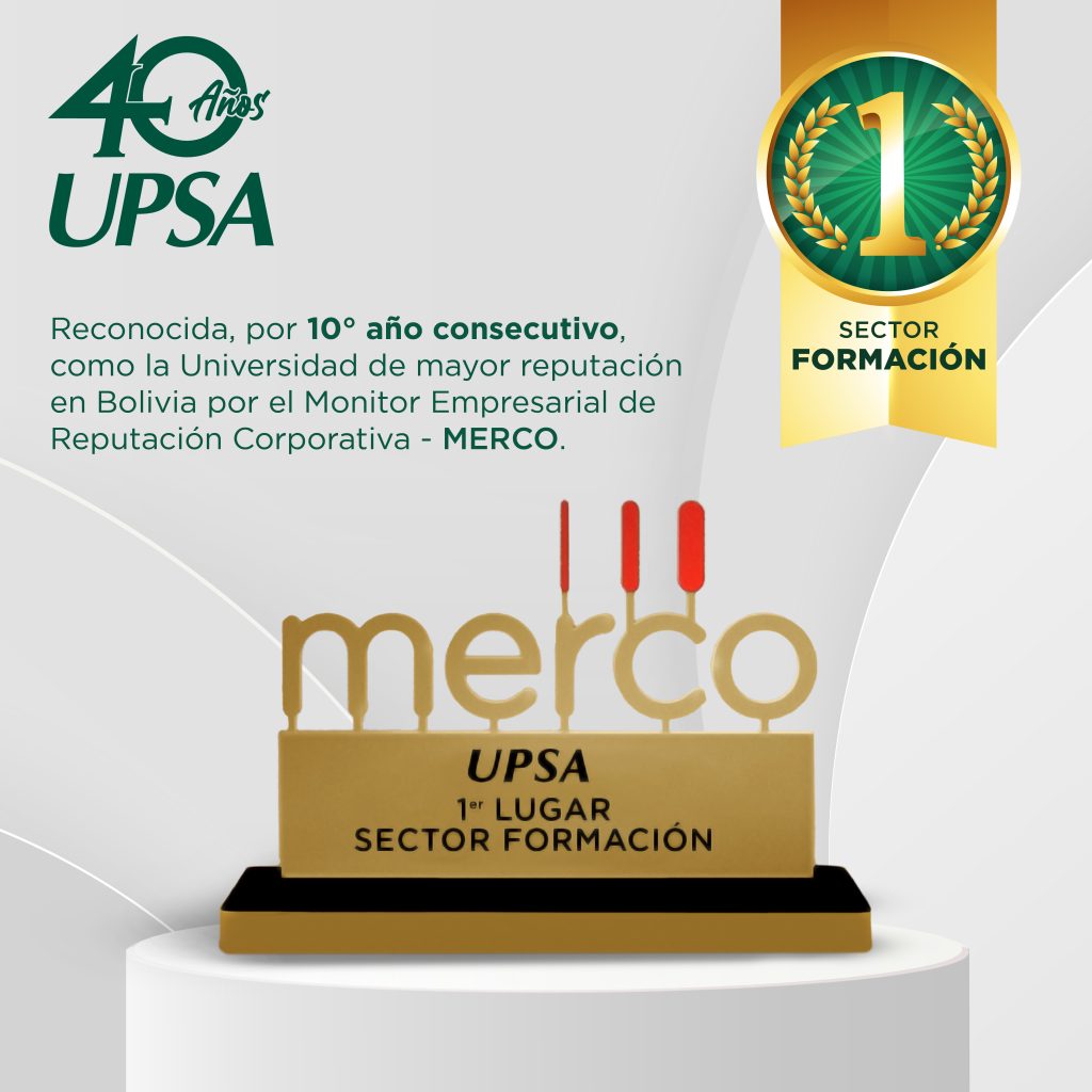 Por décimo año consecutivo, la Universidad Privada de Santa Cruz de la Sierra – UPSA, consiguió posicionarse en el primer puesto del sector Formación del Monitor Español Empresarial de Reputación Corporativa MERCO en su 11va. edición, convirtiéndose en la Universidad con la mejor reputación de Bolivia, así lo informaron los representantes en nuestro país, del prestigioso ranking internacional. La Universidad, también logró ubicarse en el tercer puesto entre las empresas mejor valoradas por los periodistas del área económica.